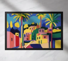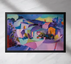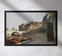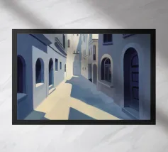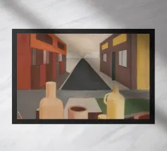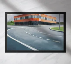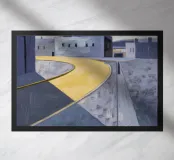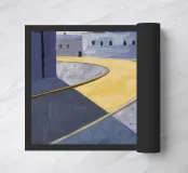 Un sentiero giallo brillante si snoda elegantemente attraverso un paesaggio minimalista di edifici grigi e squadrati. Il dipinto è uno studio sul contrasto dei colori e sulle forme geometriche pulite, che creano una scena urbana serena ma di grande impatto visivo.