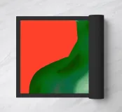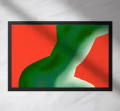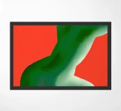 Una forma astratta verde assume una posa dinamica su uno sfondo arancione vibrante, creando un contrasto audace e un impatto visivo sorprendente. La figura sembra essere seduta, con un'enfasi sulle curve morbide e sui gradienti.