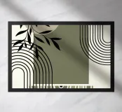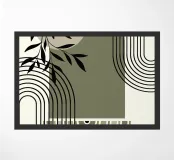 Forme geometriche astratte e linee curve creano una composizione armoniosa nei toni del verde e del nero. Un elemento botanico aggiunge un tocco organico tra le forme strutturate.