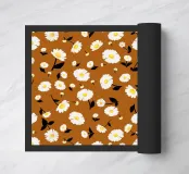 Elegante stampa floreale boho chic con freschi fiori bianchi di margherita con pistilli gialli e gradini e foglie nere, su uno sfondo arancione bruciato.