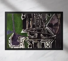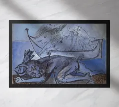 Questa litografia di Marc Chagall illustra una scena biblica, probabilmente raffigurante il re Davide che fugge da una finestra mentre la moglie Michal fa la guardia. Eseguita nella caratteristica tavolozza blu, grigia e bianca di Chagall, cattura un momento di dramma, lealtà e passione. Le figure sognanti e fluttuanti e la semplice ambientazione architettonica trasmettono una narrazione emotiva e senza tempo.