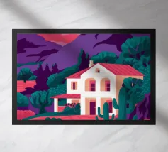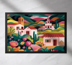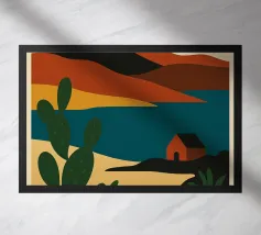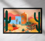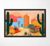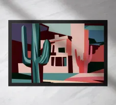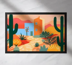 Un paesaggio desertico è caratterizzato da un sentiero tortuoso che conduce a una piccola casa, circondata da cactus e varie piante del deserto. I toni caldi dell'arancione e del rosa riempiono il cielo e lo sfondo, dando l'impressione di un tramonto sereno.