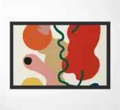 Una moderna composizione astratta mostra forme organiche e audaci nei colori rosso e blu, che si fondono con piccoli elementi neri e gialli su uno sfondo neutro.