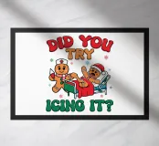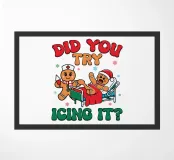 Un'infermiera di pan di zenzero si prende cura di un omino di pan di zenzero ferito che giace in un letto d'ospedale. In alto, lettere rosse e verdi in grassetto chiedono ironicamente: "Hai provato a glassarlo?".