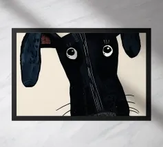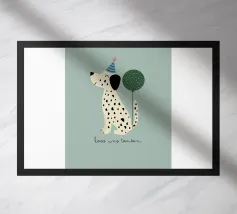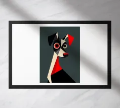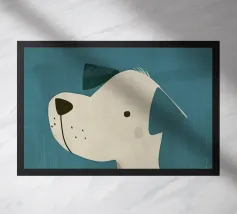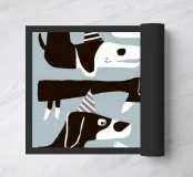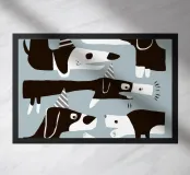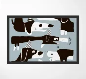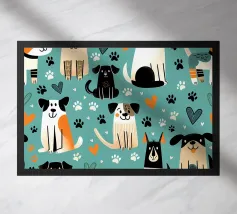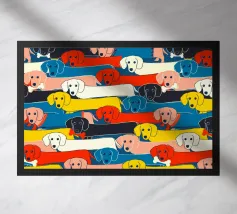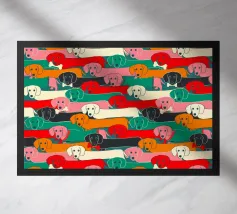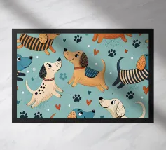 Vari cani stilizzati di diverse razze e colori sono disposti in modo giocoso in un motivo ripetuto su uno sfondo chiaro. L'illustrazione è divertente, eccentrica e celebra la diversità canina.
