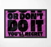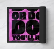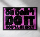 "Il testo nero in grassetto 'Fallo o non farlo, ti pentirai di entrambe le cose' è disposto in modo sovrapposto su uno sfondo rosa vibrante di carta stropicciata e trasmette un senso di urgenza e di riflessione esistenziale",
