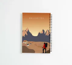 Design da viaggio minimalista delle Tre Cime, di un escursionista e di un noto rifugio nelle Dolomiti, che si trovano nella parte italiana delle Alpi e sono una destinazione di vacanza popolare per gli escursionisti e gli alpinisti.