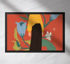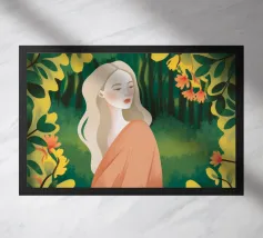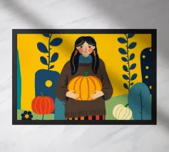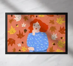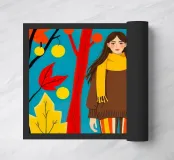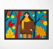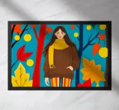 Una scena autunnale con una giovane donna che cammina lungo un sentiero che attraversa una colorata foresta autunnale. Lo sfondo è di un vivace azzurro cielo, che crea un contrasto deciso con le tonalità calde delle foglie e del fogliame autunnale. La donna indossa uno spesso maglione marrone, una sciarpa giallo senape avvolta attorno al collo e pantaloni a righe verticali arancioni, gialle e bianche che riprendono le tonalità autunnali circostanti.