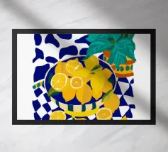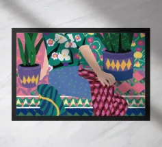 Un ritratto stilizzato di una donna con fluenti capelli scuri circondata da un'abbondanza di fiori e frutti colorati, che celebra la vita, la fertilità e la creatività.