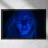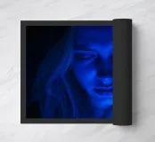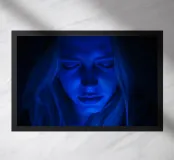 Una donna con i capelli lunghi siede tranquillamente in uno spazio buio, illuminato da un'intensa luce blu. I suoi occhi sono chiusi e sembra essere immersa in un pensiero o in una riflessione in un ambiente atmosferico.