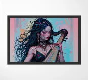 Young woman with very long black hair and a black dress plays a string instrument.