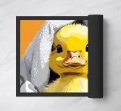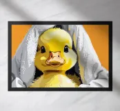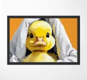 Un simpatico anatroccolo fa capolino da sotto un morbido asciugamano bianco. Le sue soffici piume gialle e i suoi occhi curiosi creano una scena adorabile e affascinante.