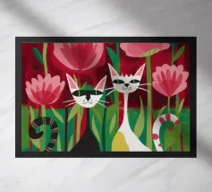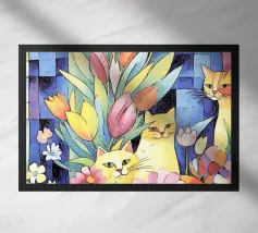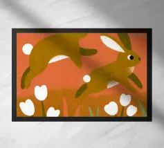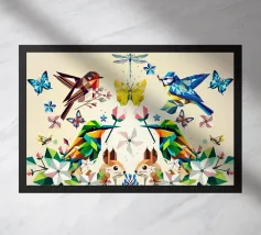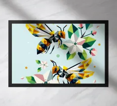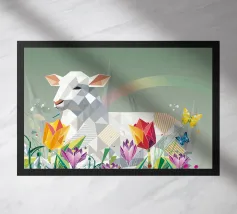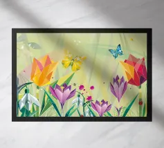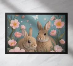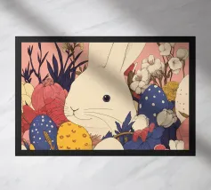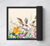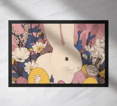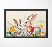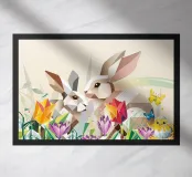 Due coniglietti pasquali stilizzati tra fiori colorati, pulcini e farfalle: un motivo allegro in stile poligonale, ideale per il periodo pasquale e l'inizio della primavera. Due coniglietti geometrici come motivo centrale Fiori primaverili colorati e crochi Inclusi simpatici pulcini e farfalle svolazzanti Design moderno e giocoso per la Pasqua Ideale per prodotti stagionali dal sapore primaverile
