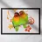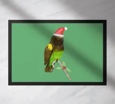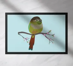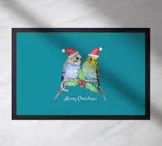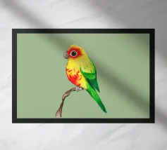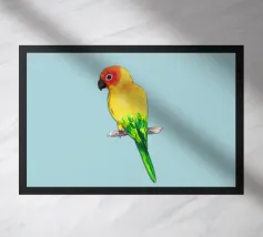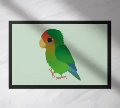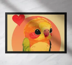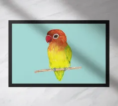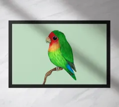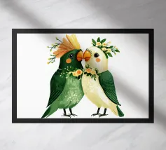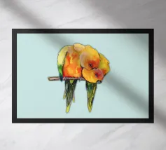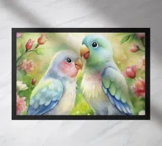 Un'immagine di due inseparabili della pesca appollaiati l'uno accanto all'altro. Elementi floreali aggiunti digitalmente. Sembrano molto rilassati e guardano l'osservatore.