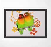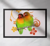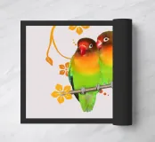 Un'immagine di due inseparabili della pesca appollaiati l'uno accanto all'altro. Elementi floreali aggiunti digitalmente. Sembrano molto rilassati e guardano l'osservatore.