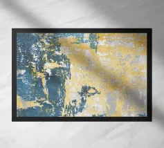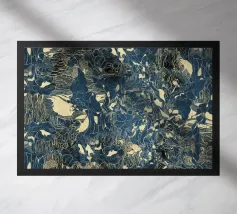 Un disegno dinamico e astratto presenta motivi vorticosi in tonalità di blu, bianco e accenni di giallo, suggerendo un senso di movimento e fluidità. Le aree di colore contrastante creano un effetto visivo suggestivo che ricorda elementi naturali come l'acqua e il vento.