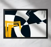 Forme astratte in nero, bianco e oro creano una composizione dinamica con curve fluide e angoli acuti. Il gioco di colori aggiunge profondità e movimento, suggerendo un senso di energia e contrasto.