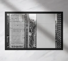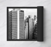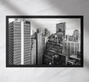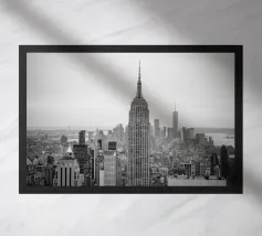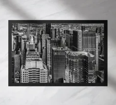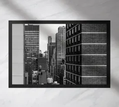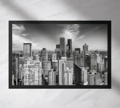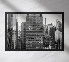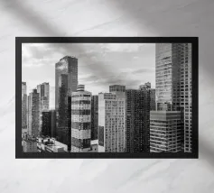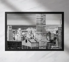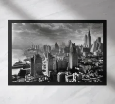 La splendida fotografia in bianco e nero cattura lo skyline di Manhattan, mostrando gli imponenti grattacieli e le loro eleganti facciate in una composizione geometrica da una prospettiva aerea. Con riflessi visibili alla luce del giorno, questo poster di lusso incarna l'arte moderna ed è un'aggiunta elegante agli interni contemporanei.