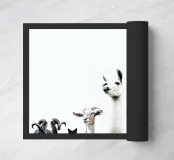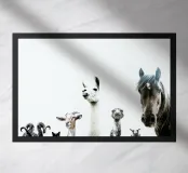 Questa stampa fotografica presenta un gruppo di animali da fattoria, tra cui un maestoso cavallo, una giocosa capra, un saggio gufo, un soffice lama, un sorprendente emu, un curioso gatto nero e un regale ariete. Questa stampa unica celebra la bellezza degli animali domestici ed è perfetta per gli amanti degli animali e della natura.