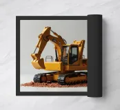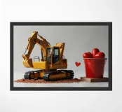 Un escavatore giallo è posizionato accanto a una benna rossa piena di oggetti a forma di cuore, che simboleggiano l'amore. L'ambientazione è caratterizzata da un terreno soffice, che aggiunge un tocco unico al tema di San Valentino.