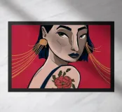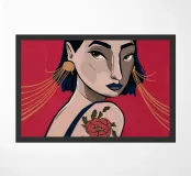 Questo dipinto raffigura una persona con un tatuaggio di una rosa sulla spalla. La persona indossa grandi orecchini d'oro e lo sfondo è di un rosso intenso, che sottolinea la natura audace ed espressiva dell'opera.