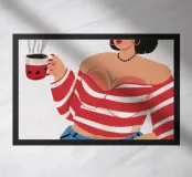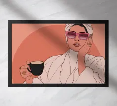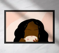 Un'illustrazione bella e realistica di una donna con un top offtheshoulder, che chiude gli occhi in segno di beatitudine mentre si gode una tazza di caffè fumante. L'opera d'arte è un'ode semplice e potente al piacere di un buon caffè.