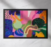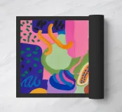 Una composizione astratta vivace e giocosa, caratterizzata da una serie di forme organiche simili a blob in blu, rosa e giallo. Le forme spontanee e i colori energici creano un senso di gioiosa espressione artistica.