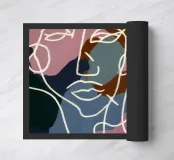Questa opera d'arte presenta una serie di disegni al tratto di volti interconnessi su uno sfondo scuro. Le linee sono continue e creano un senso di unità e connessione.