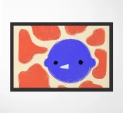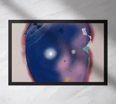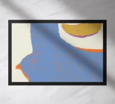 Un volto blu incorniciato da forme astratte arancioni su uno sfondo beige.