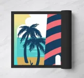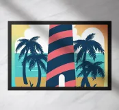 faro palme spiaggia tropicale costa uccelli tramonto-cielo sabbia soffice orizzonte marino nuvole scale ponte di osservazione finestra del faro torre del faro motivo a strisce palme sagomate crepuscolo-atmosfera mare calmo spiaggia-vacanza vista sull'oceano scena costiera