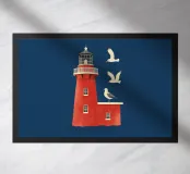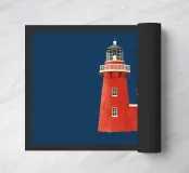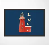 L'immagine mostra un suggestivo faro rosso con tetto nero e balaustra bianca. Due finestre ornano la facciata, mentre tre gabbiani completano il motivo marittimo - uno seduto, due in volo. Lo sfondo blu scuro crea un forte contrasto e rafforza l'atmosfera serena e chiara. Stilisticamente, l'immagine è illustrativa e minimalista, con linee pulite e una palette di colori vivaci. I colori decisi e la rappresentazione semplificata conferiscono al motivo un'estetica moderna, quasi grafica, che irradia calma e vagabondaggio allo stesso tempo.