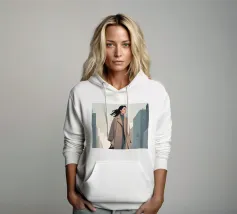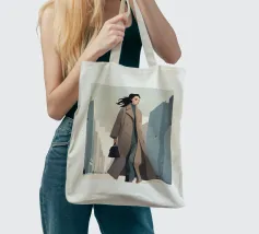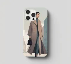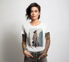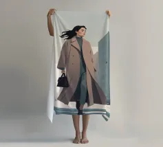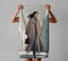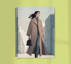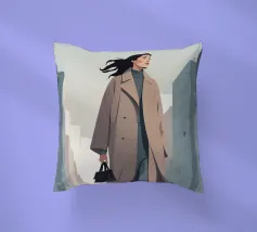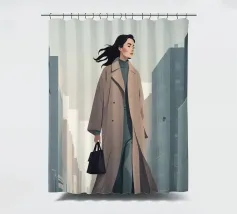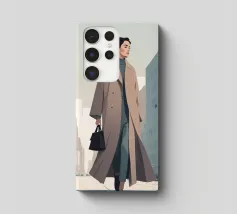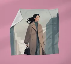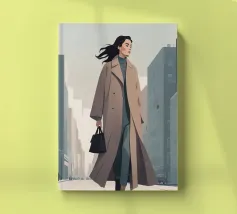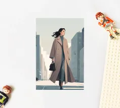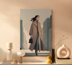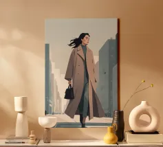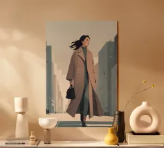 Una donna elegante cammina in un ambiente urbano sobrio, con il cappotto che scorre e la borsetta in mano. I toni calmi e la luce delicata sottolineano l'indipendenza e lo stile sicuro di sé.