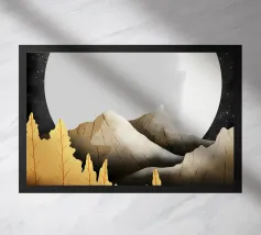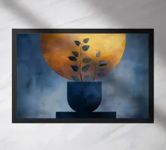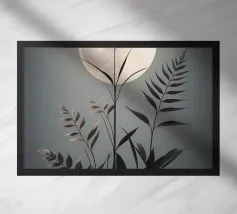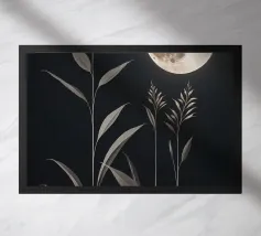 Questa accattivante stampa presenta una luna piena, immersa in un morbido bagliore dorato, su uno sfondo nero profondo. Due eleganti fiori stilizzati, uno con petali scuri e quasi iridescenti e l'altro con delicate foglie dorate, si ergono sotto il globo lunare. Il gioco di luci e ombre, unito agli intricati dettagli degli elementi floreali, crea un pezzo davvero ipnotico che aggiungerà un tocco di bellezza celestiale a qualsiasi spazio.
