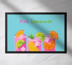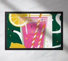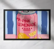 Una lattina di "Pink Lemonade" è illustrata in un vivace stile pop art, completa di condensa, cannuccia spumeggiante, fetta di limone fresco e fragola.