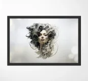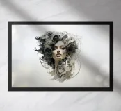 A surreal depiction of a woman's face surrounded by intricate abstract geometric patterns and swirling hair, blending organic and futuristic design elements. The artwork highlights creativity and modern aesthetics.
