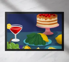 Vista dall'alto di una scena di ristorazione moderna con un flan o un creme caramel e una fetta di torta alla frutta su uno sfondo colorato e suddiviso in sezioni.