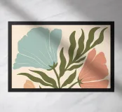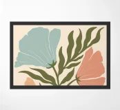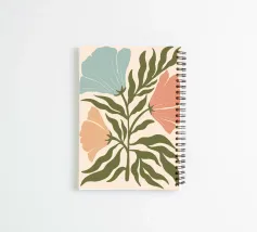 Fiori pastello tenui e foglie verdi creano un design botanico elegante e minimalista. Su uno sfondo chiaro, i petali blu, pesca e corallo aggiungono un tocco sereno e armonioso.
