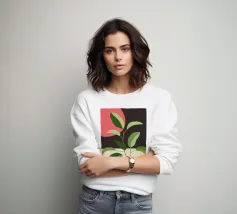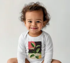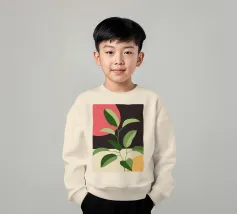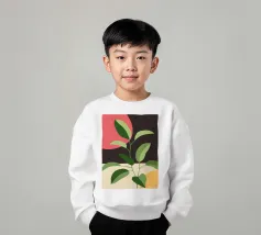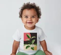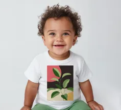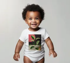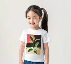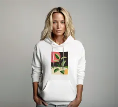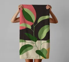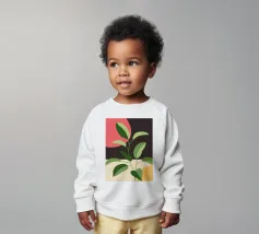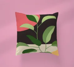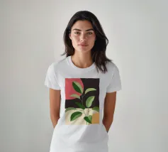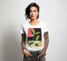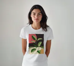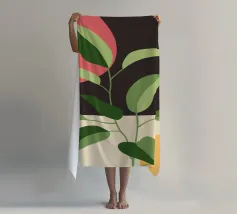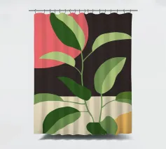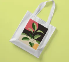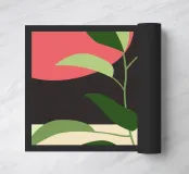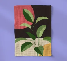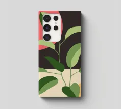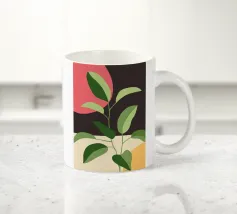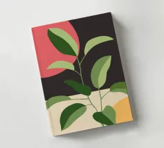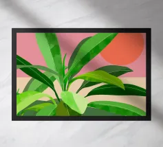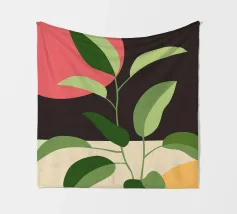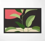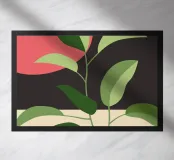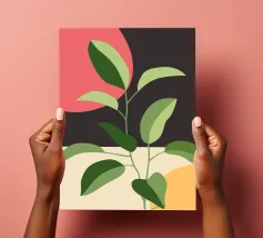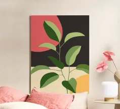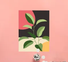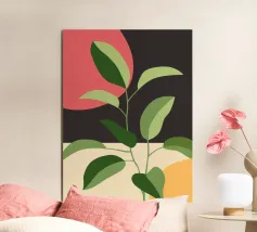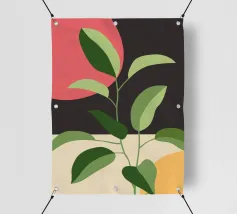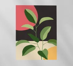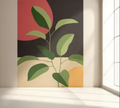 Una composizione botanica astratta caratterizzata da foglie stilizzate e una semplice forma di sole.