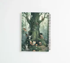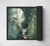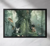In the heart of a whimsical forest, tiny woodland creatures gather around an ancient tree. Foxes, raccoons, bunnies, and mysterious friends peek out from mossy roots and leafy branches, each with their own little story. Illustrated in soft greens and earthy tones, this magical scene invites children into a world of gentle curiosity and natural wonder. A timeless piece for storytelling and dreamy nursery decor.