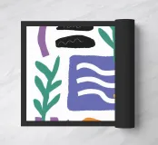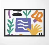 Una composizione dinamica di varie forme astratte, ghirigori e forme simili a foglie in una tavolozza giocosa di viola, blu e arancione, sparse su uno sfondo bianco.