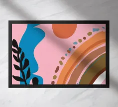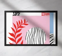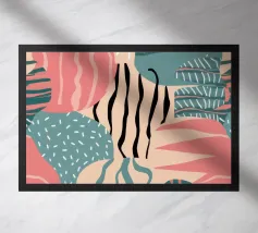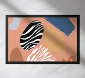 Un'opera d'arte astratta contemporanea che combina diverse texture e forme. Un'audace pennellata blu contrasta con un ovale zebrato e con morbide forme organiche di foglie, creando una composizione dinamica e tattile.