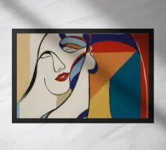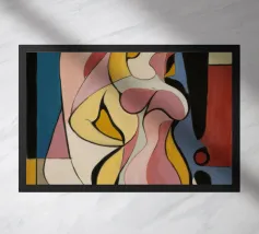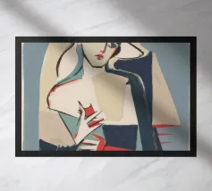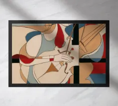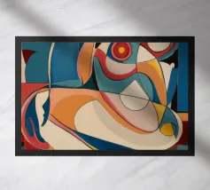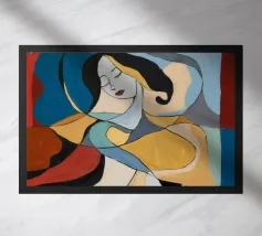 Quest'opera d'arte presenta una composizione contemplativa e introspettiva con un mix di forme geometriche e organiche. La tavolozza dei colori comprende blu, rosso e beige, creando un senso di equilibrio e armonia. La disposizione ponderata di forme e colori ne fa un'opera accattivante.
