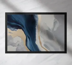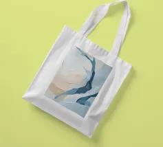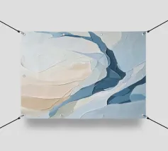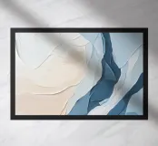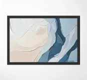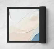 Pittura a olio astratta con forme bianche e blu chiaro, completate da beige, blu navy e grigio su uno sfondo chiaro. Curve e pennellate delicate creano una composizione minimalista e moderna con una superficie strutturata.