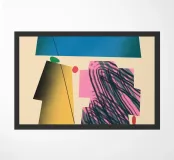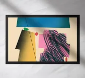 Forme geometriche audaci in blu, giallo e rosa contrastano con uno sfondo neutro. Ombre organiche e punti colorati creano una composizione dinamica e astratta.