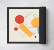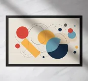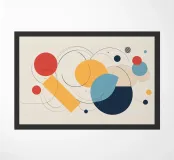 L'opera d'arte presenta una disposizione dinamica di forme geometriche dai colori vivaci. Cerchi, rettangoli e linee si intrecciano, creando un senso di movimento ed equilibrio.