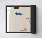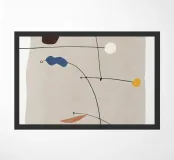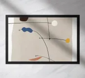 Le forme astratte sono collegate da sottili linee nere su uno sfondo beige chiaro, creando un senso di equilibrio. La composizione presenta varie forme geometriche in diversi colori, tra cui marrone, rosso, blu, bianco e giallo.