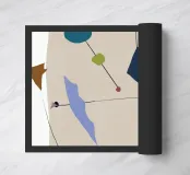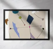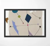 Forme astratte in colori tenui sono collegate tra loro da sottili linee nere, creando una composizione dinamica. Il disegno incorpora varie forme geometriche e organiche, aggiungendo un senso di equilibrio e movimento.