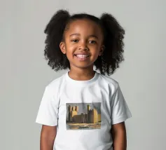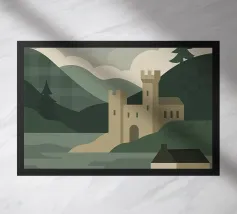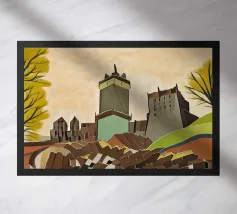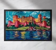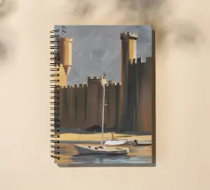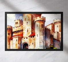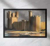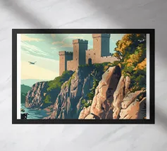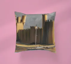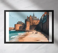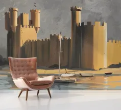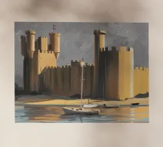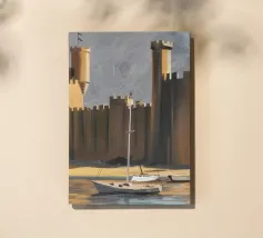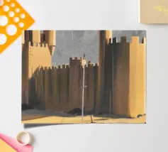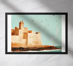 Una formidabile e semplice fortezza con alte mura e torri si erge sul bordo del mare, la cui forma spoglia è evidenziata dalla luce di un sole basso.
