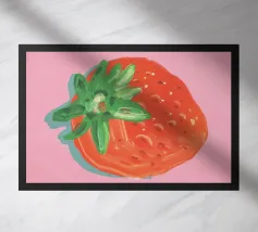 Un'affascinante illustrazione di una persona che indossa un costume da fragola con un'espressione simpatica.