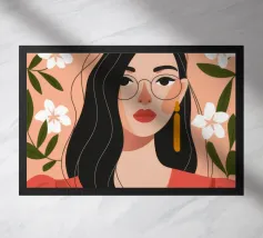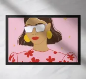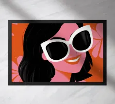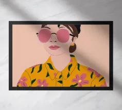 Ritratto di una donna elegante con occhiali da sole, orecchini di perle e camicetta rosa a fiori, che emana sicurezza e modernità.